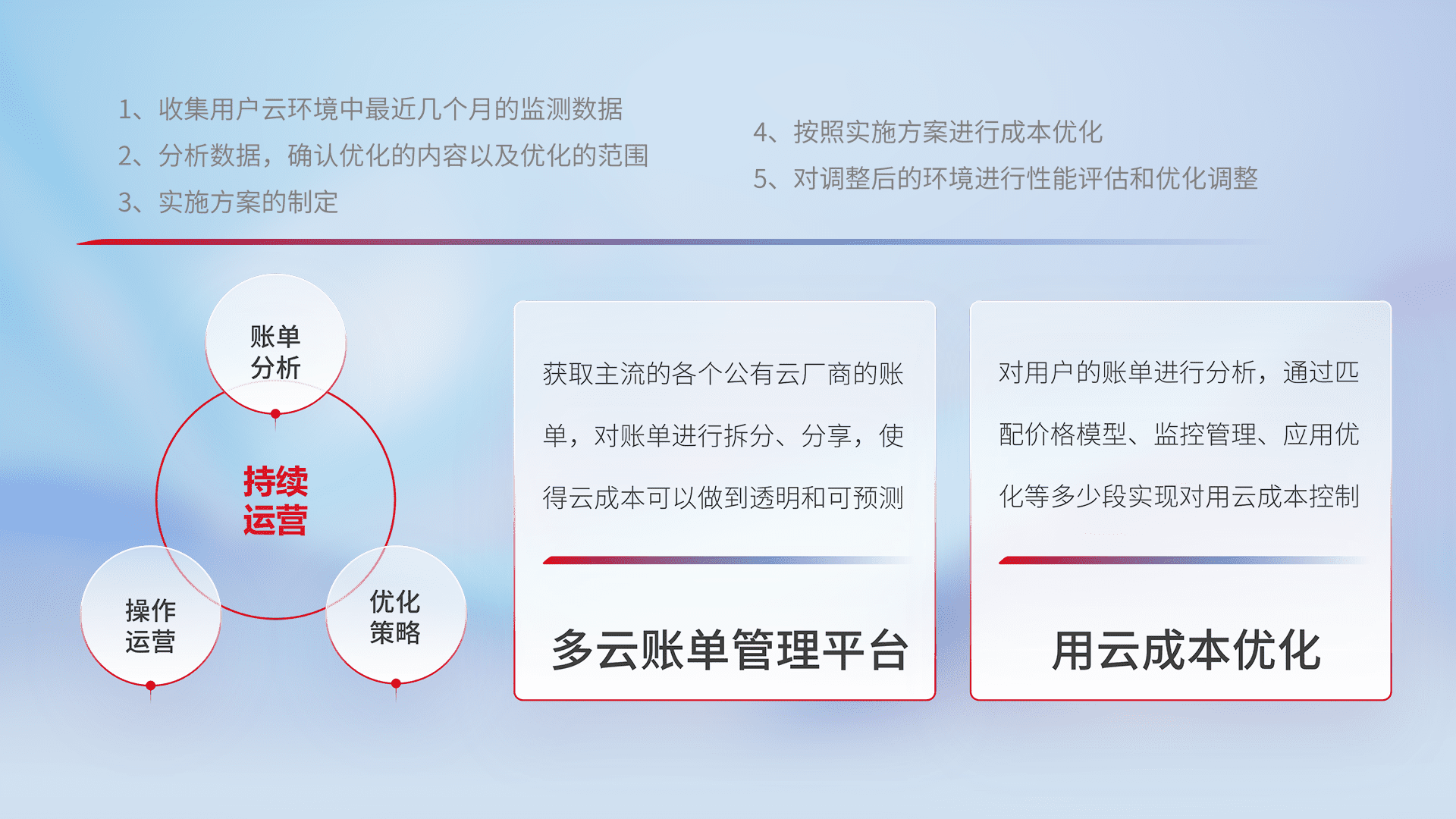 通过多云纳管,,,,以统一的资源数据模型把客户的云资源进行抽象和封装,,进而实现对多云资源的统一操作,,,保障云资源管理的可靠性、、稳定性与可用性。。。量身定制化运维内容,,配置、、、开发运维、、、、补丁管理、、、备份、、、监控、、认证和访问管理、、、审计和日常巡检等,,,,保障在用云过程中的可靠度,,稳定度以及高可用率。。。。